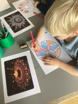 This week we have been learning about the Hindu and Sikh festival of Diwali. We have been finding out about Rangoli patterns that decorate the entrance to homes. These patterns bring good luck and fortune for the coming year. We then created our own patterns inside and outside. PrevNext